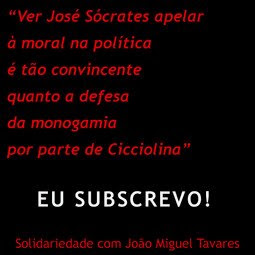 Também eu subscrevo quase na íntegra este artigo do João Miguel Tavares, à excepção do pormenor da Cicciolina. Já quanto a não lhe faltar qualidades para ser primeiro-ministro: lamento, João Miranda, mas concordo, acho que o homem nasceu para isto, para esta mediocridade merdosa que nos tem governado. A política portuguesa tem sido um filtro digital calibrado a retroacção e afinado para a selecção deste tipo de gente. O pior disto tudo é que não vejo ninguem - NINGUÉM - da nova geração de políticos dos partidos do regime que queira mudar isto.
